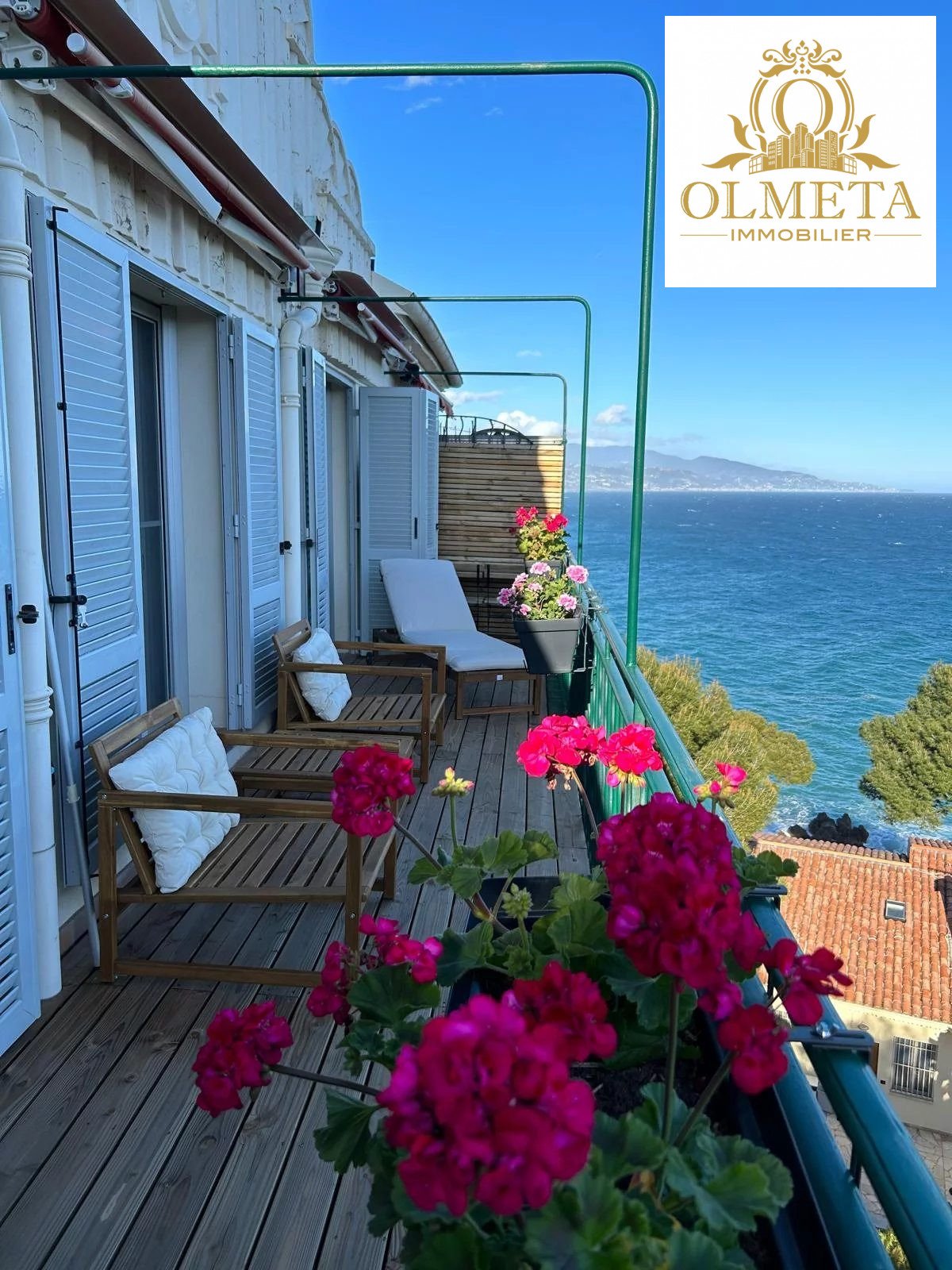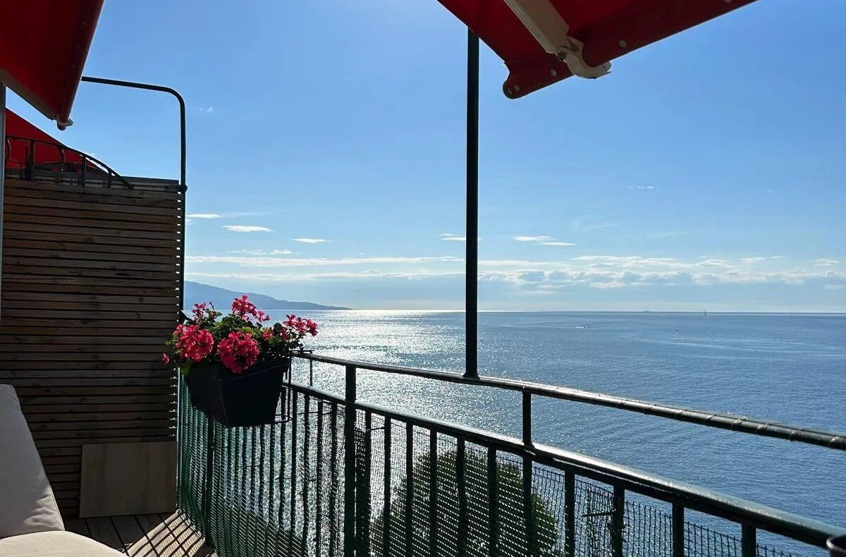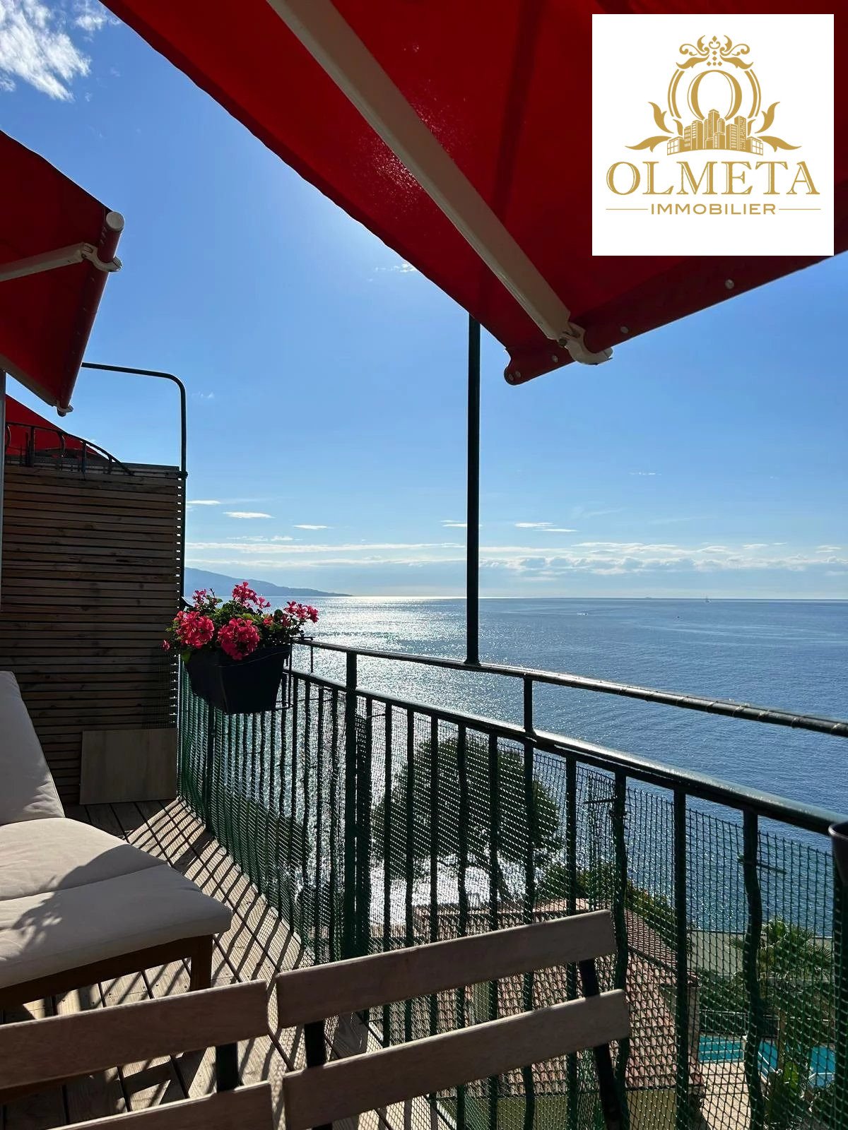 Dernier étage ! Bel appartement lumineux d’une surface totalisant 113 m2 sur deux niveaux avec terrasse de 17m2 et vue mer époustouflante, situé dans une résidence de standing « pavillon Sissi » sur la prestigieuse avenue Winston Churchill plateau du cap. L’appartement a été entièrement rénové avec soin. Le niveau principal supérieur offre un salon séjour cuisine ouverte équipée, et une belle chambre parentale avec salle de douche et wc indépendant le tout ouvert sur un large balcon à la vue mer époustouflante. Au niveau inférieur, deux chambres lumineuses, vue mer depuis toutes les fenêtres, une salle d’eau, un espace buanderie et une entrée indépendante. Un grand garage en sous-sol vient compléter cette offre. LOYER 5000 Euros CC Dépôt de garantie 4700 euros Honoraires résidence principale (13e/m2 Recherche locataire, constitution du dossier, visite, rédaction du bail + 3e/ m2 pour état des lieux entrée) Honoraires bail code civil – un mois de loyer